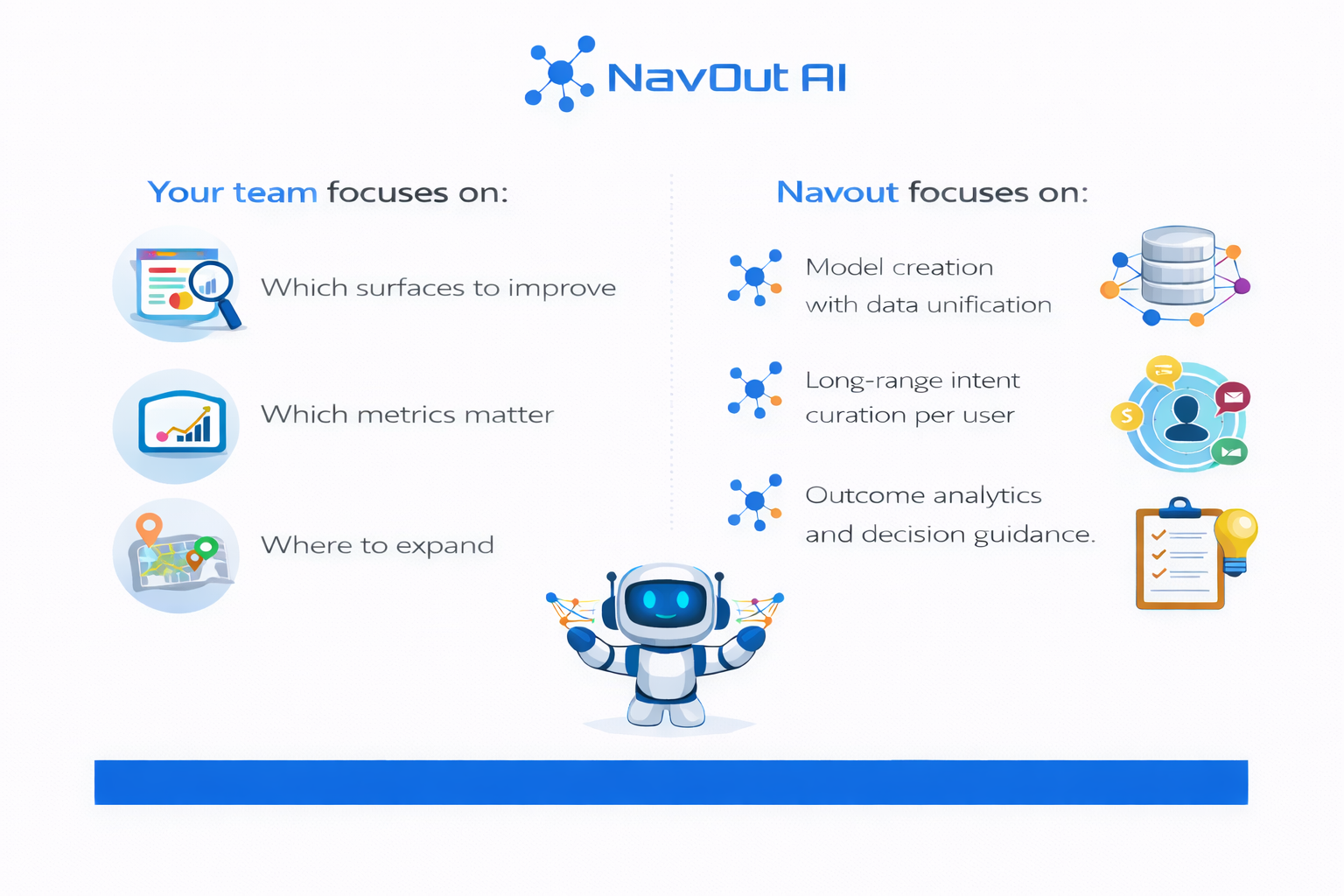 NavOut functions as the layer that unifies signals and then deploys models through interfaces that can be integrated into existing experiences. NavOut offers low lift integration and signal optimization via flexible models intended to support personalization without heavy retraining cycles.
