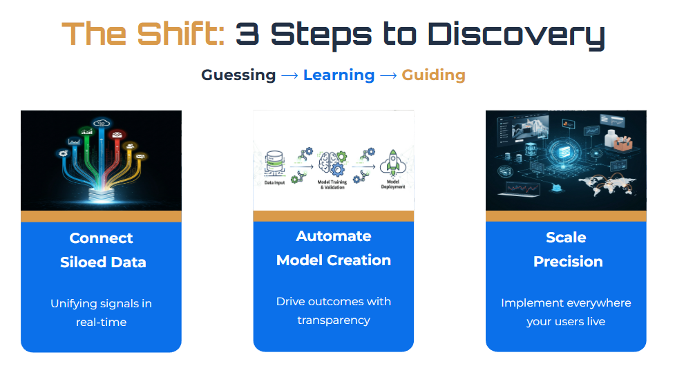Profiles are thin at the moment they matter most. Many customers arrive without a long history, so the system guesses, shows broad lists, and pushes the work back onto the user. The outcome is predictable: slower time to a confident choice, more backtracking, and lower completion rates. The business outcome is also predictable: personalization becomes a multi month effort because teams keep rebuilding pipelines and debating which signals matter.